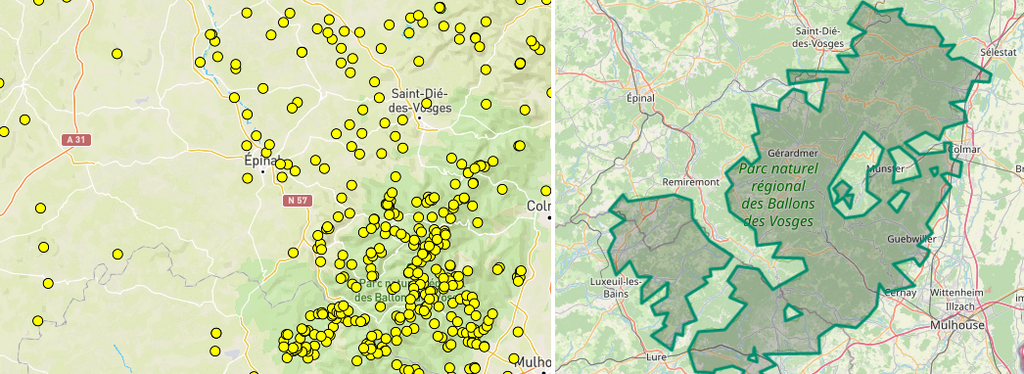 Il est nécessaire de consulter chaque site de parc ou réserve ou espace Natura 2000 pour connaître les conditions d'accès et visualiser la carte correspondante. Voir ci-dessous la carte du PNR Ballon des Vosges. Le site pota-map.fr indique aussi les limites des parcs et s'ils ont été déjà activés.